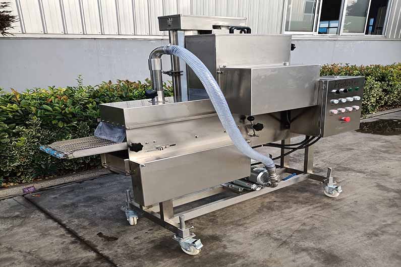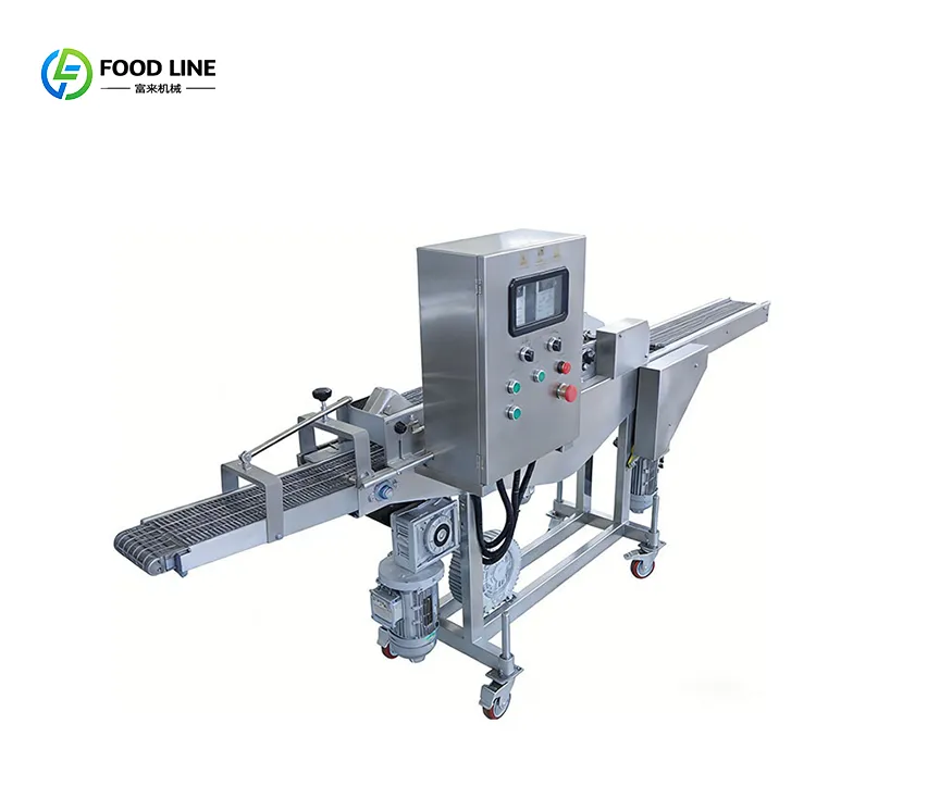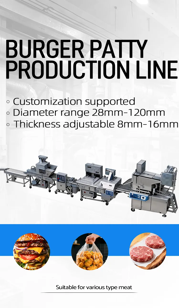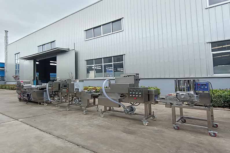 Foodline Machinery's meat patty forming production line automates the processes of meat patty making, battering, coating, and frying, providing a fast solution for large-scale production.