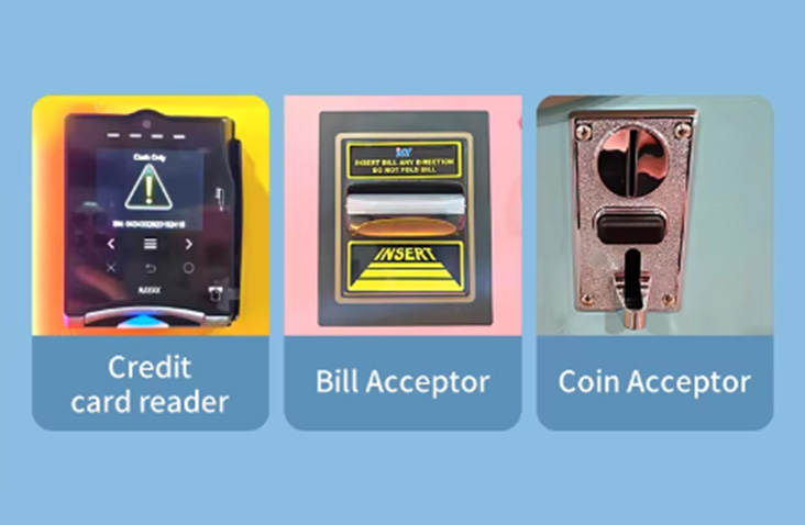 Payment options include coins, banknotes, and credit cards. Customers can choose their preferred way to pay.