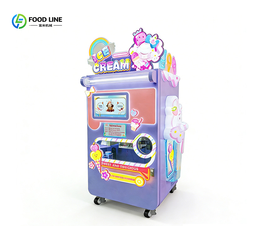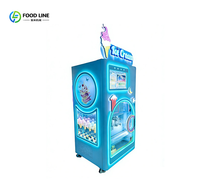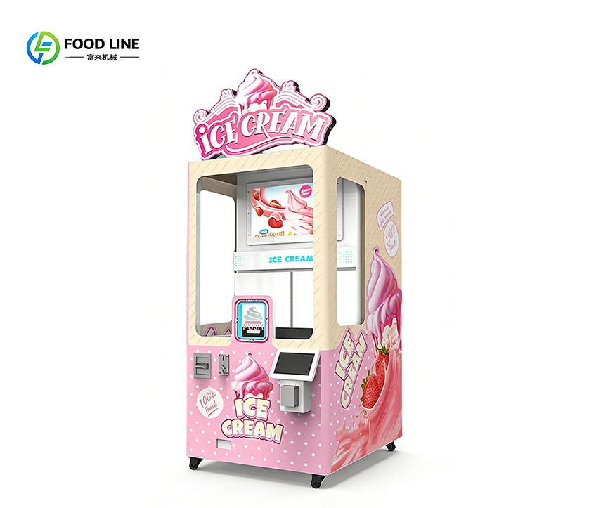 Foodline Machinery’s fully automatic ice cream vending machine serves a variety of frozen treats, such as soft-serve ice cream, cups, and cones. Customized flavors and toppings are also available.