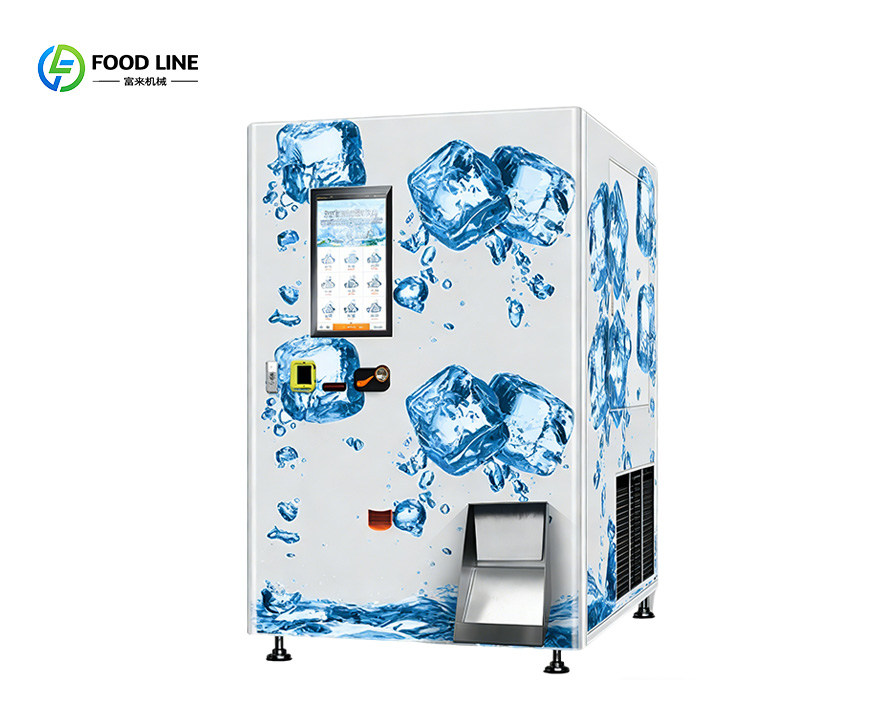 La máquina expendedora automática de hielo y agua de Foodline Machinery ofrece cubitos de hielo limpios envasados y agua potable fría. Cuenta con un gran depósito y una rápida producción de hielo.