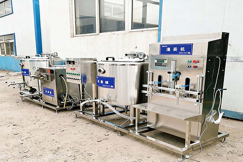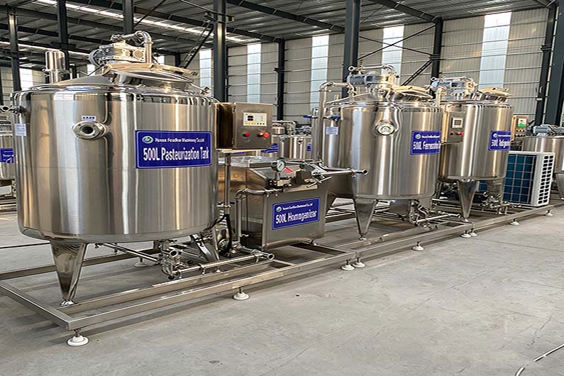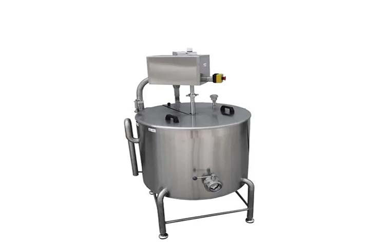 The pasteurization tank is made of three-layer stainless steel, equipped with a stirring system and automatic temperature control. The sterilization temperature is adjustable between 40-90°C, with water cooling to around 40°C.